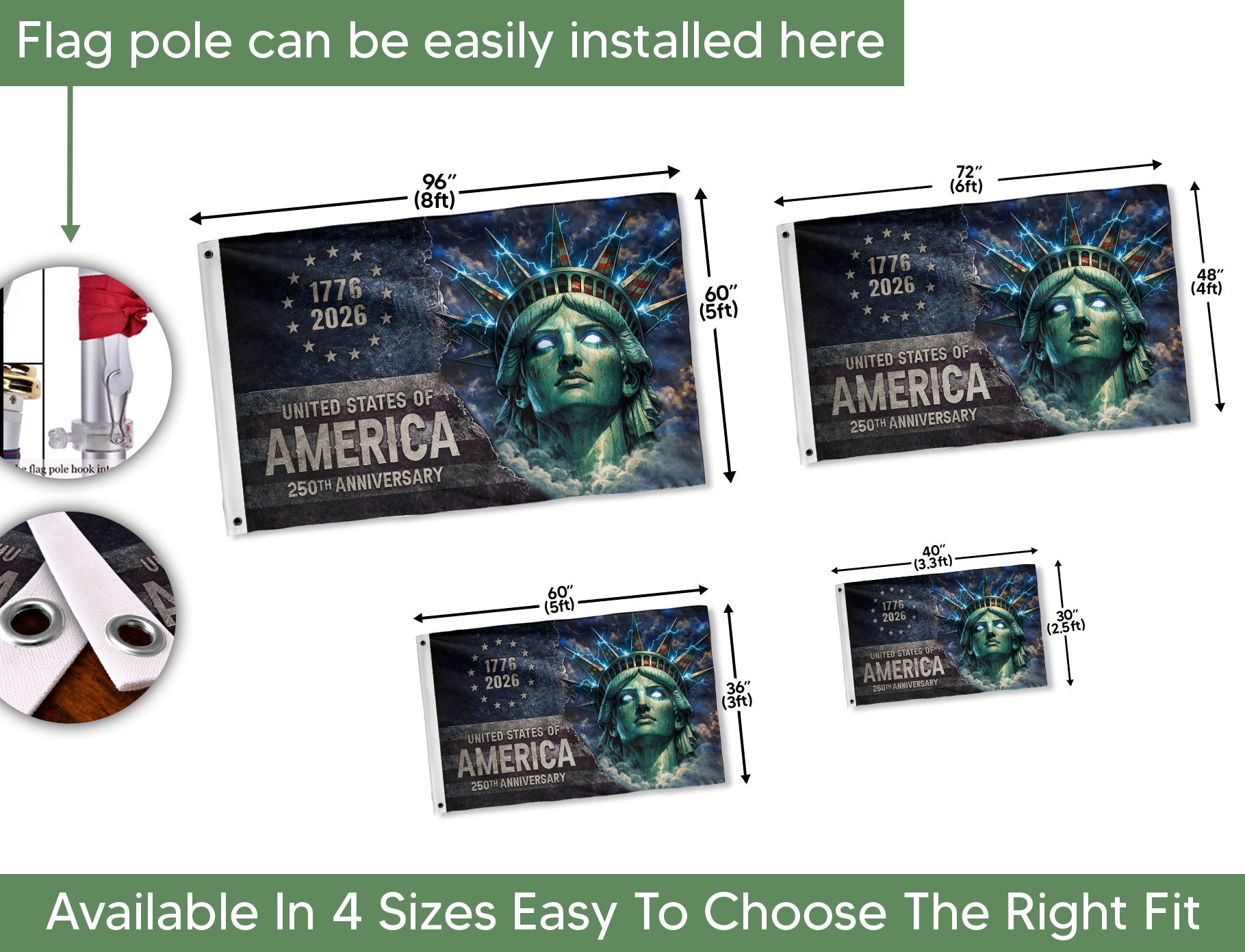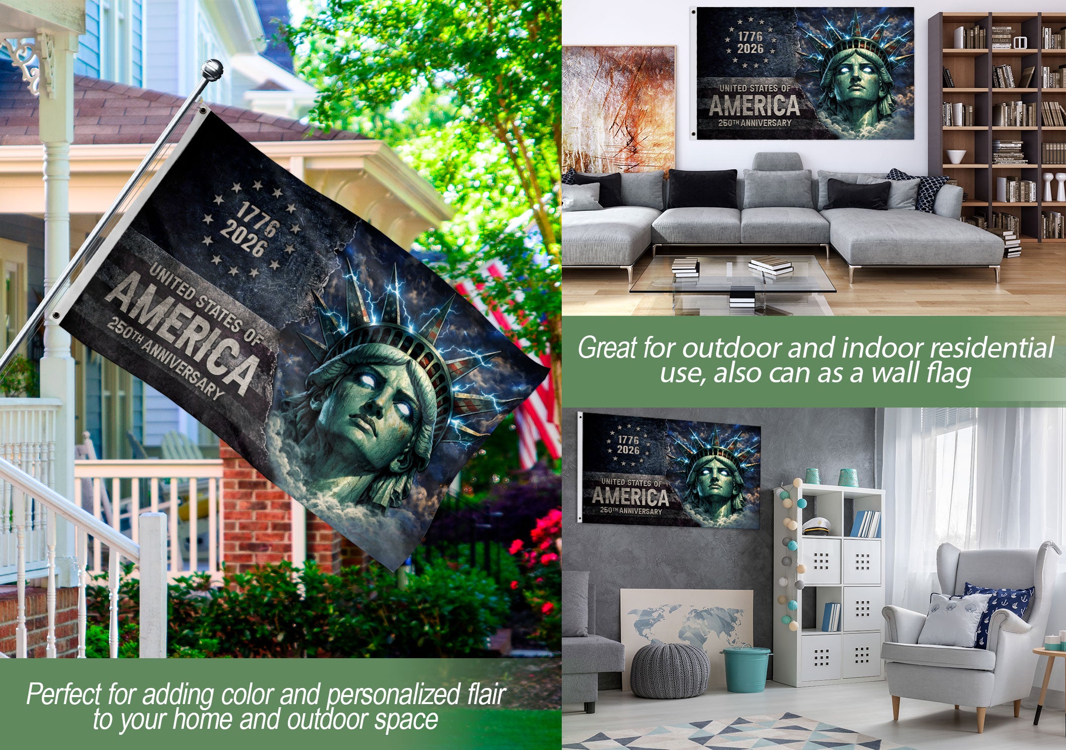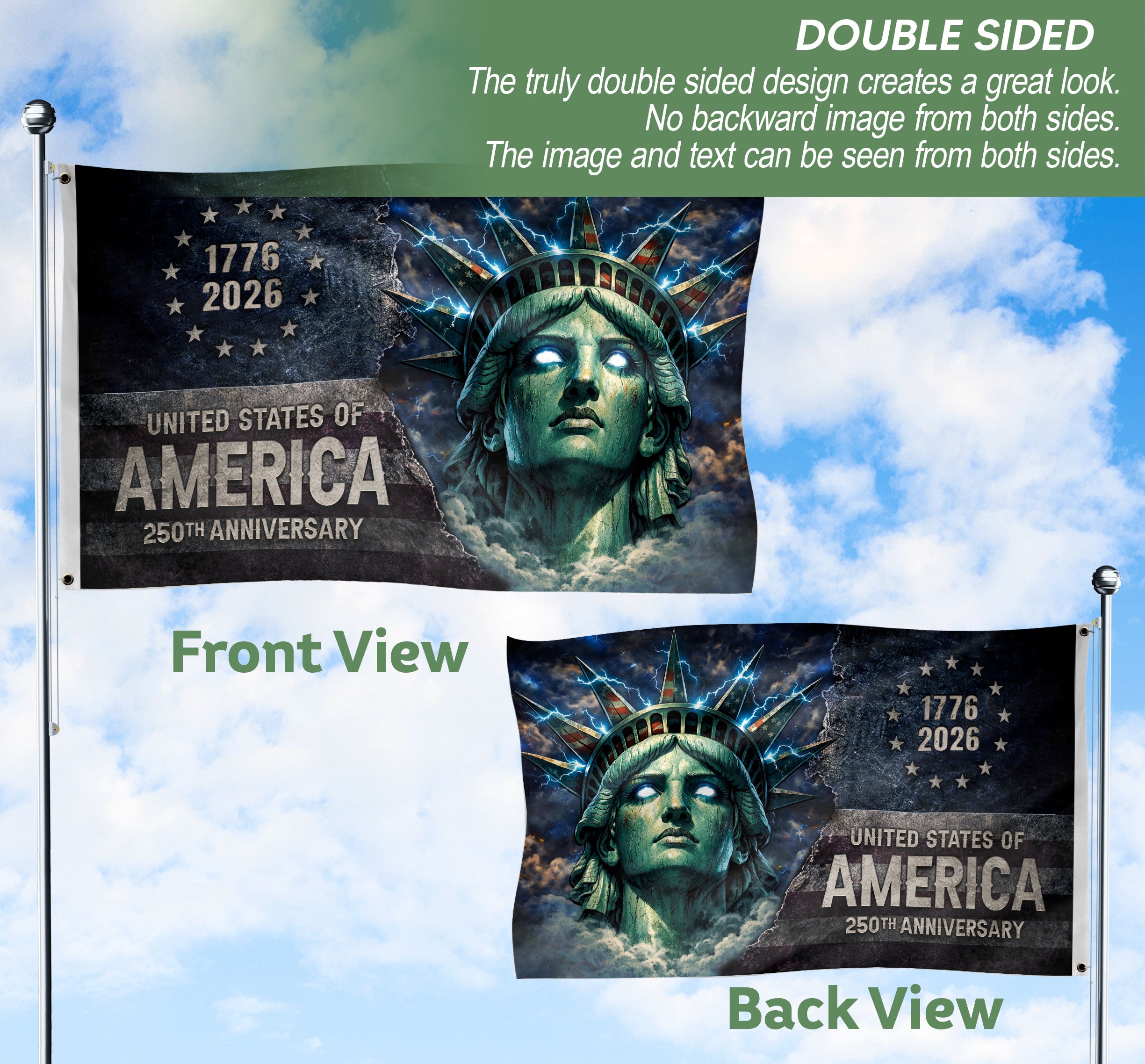 Celebrate America’s 250th Anniversary (1776–2026) with a design that fuses historical iconicity with raw, electric energy. Showcasing the Statue of Liberty surrounded by lightning-inspired streetwear graphics, this premium double-sided house flag marks the 250-year milestone with bold style and enduring national pride.