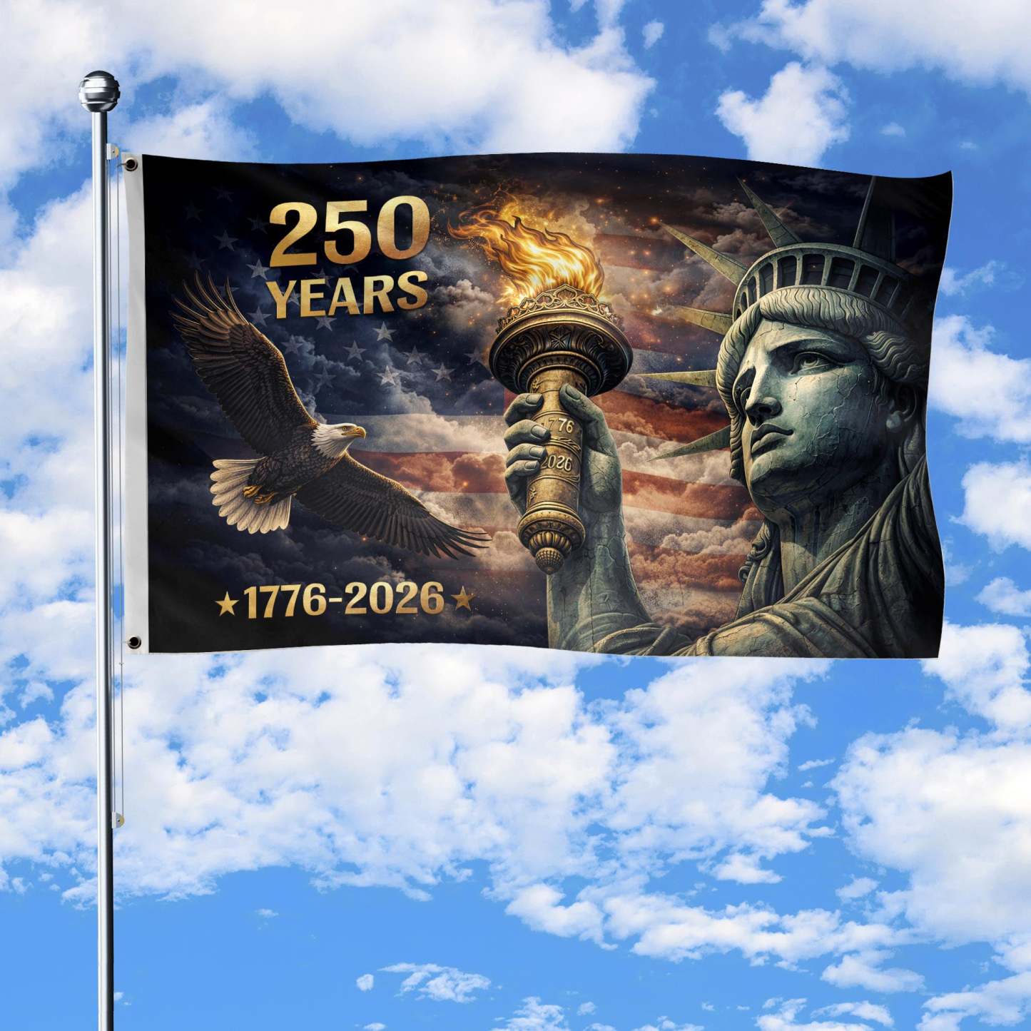 Marking 250 years of history, this dramatic flag features the iconic torch of the Statue of Liberty alongside a soaring eagle, set against a powerful American flag backdrop. The bold “250 Years” message and milestone dates 1776–2026 highlight the nation’s journey, symbolizing freedom, strength, and enduring ideals of the United States. A meaningful display for home décor, outdoor spaces, and commemorating the historic 250th anniversary.