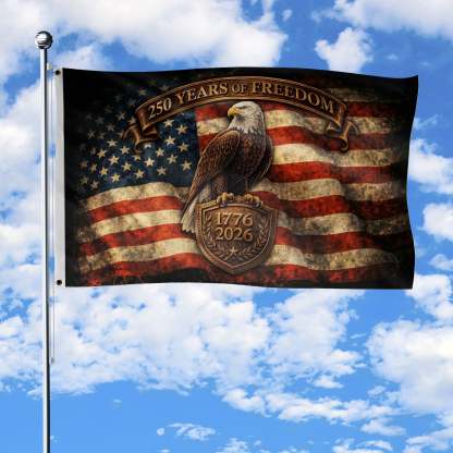 Celebrating 250 years of freedom, this bold flag features a proud eagle perched at the center, set against a classic American flag backdrop. Highlighted by the message “250 Years of Freedom” and the historic years 1776–2026, the design reflects strength, independence, and national pride. A striking decorative piece for home or outdoor display to honor the enduring legacy of the United States and its milestone anniversary.